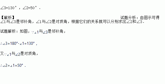 如图,已知:直线AB与CD相交于点O,∠1=50度.求:∠2和∠3的度数.