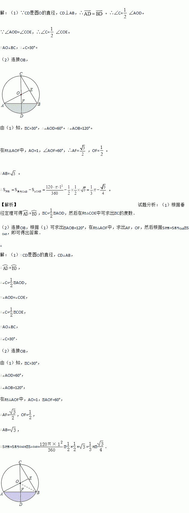 【解析】 (1)∵CD是圆O的直径,CD⊥AB,∴。∴∠C=∠AOD。 ∵∠AOD=∠COE,∴∠C=∠COE。 ∵AO⊥BC,∴∠C=30°。 (2)连接OB, 由(1)知,∠C=30°,∴∠AOD=60°。∴∠AOB=120°。 在Rt△AOF中,AO=1,∠AOF=60°,∴AF=,OF=。 ∴AB=。 ∴。 【解析】试题分析:(1)根据垂径...