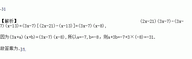 已知(2x-21)(3x-7)-(3x-7)(x-13)可因式分解为(3x+a)(x+b),其中a,b均为整数,则a+3b=_____.