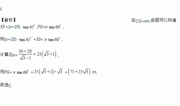 如图,某高楼顶部有一信号发射塔,在矩形建筑物ABCD的A,C两点测得该塔顶端F的仰角分别为45°和60°,矩形建筑物宽度AD=20 m,高度DC=30 m,则信号发射塔顶端到地面的高度(即FG的长)为( )