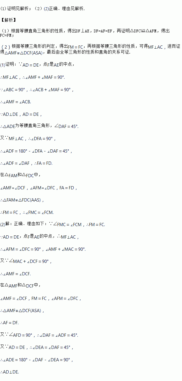 如图,∠ABC=90°,D、E分别在BC、AC上,AD⊥DE,且AD=DE,点F是AE的中点,FD、AB的延长线相交于点M,连接MC.