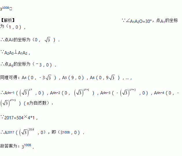 如图,点A1的坐标为(1,0),A2在y轴的正半轴上,且∠A1A2O=30°,过点A2作A2A3⊥A1A2,垂足为A2,交x轴于点A3,过点A3作A3A4⊥A2A3,垂足为A3,交y轴于点A4;过点A4作A4A5⊥A3A4,垂足为A4,交x轴于点A5;过点A5作A5A6⊥A4A5,垂足为A5,交y轴于点A6;…按此规律进行下去,则点A2017的横坐标为_____.