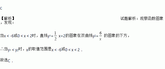 C 【解析】试题解析:观察函数图象,发现: 当x<-6或0<x<2时,直线y1=x+2的图象在双曲线y2=的图象的下方, ∴当y1<y2时,x的取值范围是x<-6或0<x<2. 故选C.
