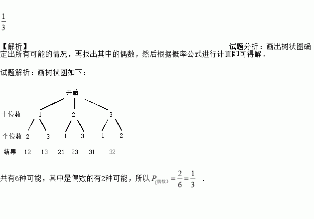 【解析】试题分析:画出树状图确定出所有可能的情况,再找出其中的偶数,然后根据概率公式进行计算即可得解. 试题解析:画树状图如下: 共有6种可能,其中是偶数的有2种可能,所以 .