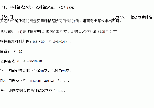 (1)甲种铅笔10支、乙种铅20支;(2)16元 【解析】试题分析:根据题意结合买乙种铅笔所花的钱是买甲种铅笔所花的钱的3倍,进而得出等式求出即可. 试题解析:(1)设该同学购买甲种铅笔支,则购买乙种铅笔(30﹣)支. 根据题意可列方程:0.6(30﹣)=3×0.4, 解得: =10 乙种铅笔:30﹣=30-10=20 答:该同学购买甲种铅笔10支、乙种铅20支...