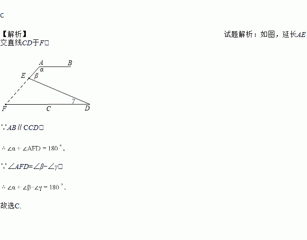 C 【解析】试题解析:如图,延长AE交直线CD于F, ∵AB∥CCD, ∵∠AFD=∠β?∠γ, 故选C.