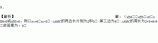 9. 【解析】【解析】 (x﹣4)(x﹣5)=0,x﹣4=0或x﹣5=0,所以x1=4,x2=5.∵△ABC的两边长分别为2和3,∴第三边为4,∴△ABC的周长为2+3+4=9.故答案为:9.