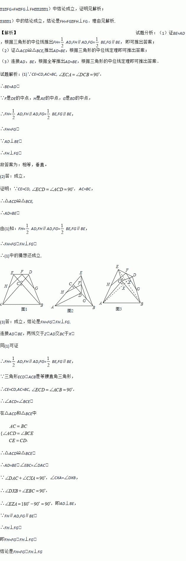 (1)如图1,两块等腰直角三角板△ABC和△ECD如图所示摆放,其中∠ACB=∠DCE=90°,点F,H,G分别是线段DE,AE,BD的中点,A,C,D和B,C,E分别共线,则FH和FG的数量关系是 ,位置关系是 .