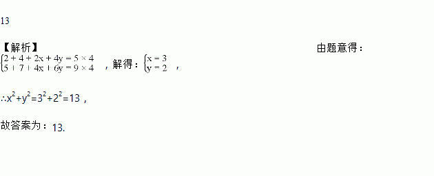 若2,4,2x,4y四个数的平均数是5;5,7,4x,6y四个数的平均数是9,则x2+y2=_________.
