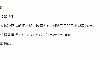 两年前生产1吨甲种药品的成本是5000元.随着生产技术的进步,成本逐年下降,第2年的年下降率是第1年的年下降率的2倍,现在生产1吨甲种药品成本是2400元.为求第一年的年下降率,假设第一年的年下降率为x,则可列方程( )