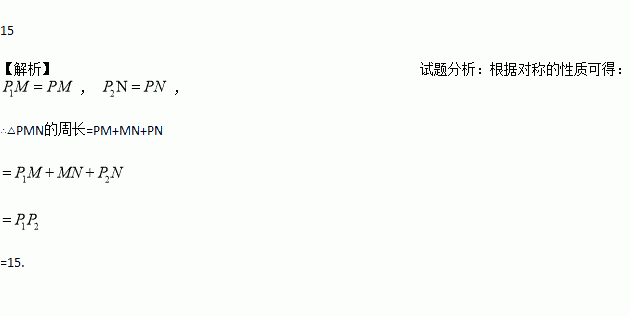 如图所示,点P为∠AOB内一点,分别作出P点关于OA、OB的对称点P1,P2,连接P1P2交OA于M,交OB于N,P1P2=15,则△PMN的周长为__.