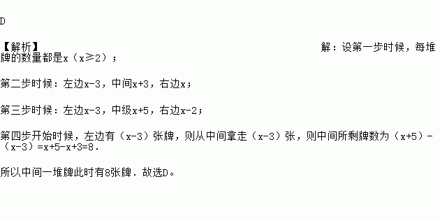 这时,小明准确说出了中间一堆牌现有的张数,你认为中间一堆的张数是( )