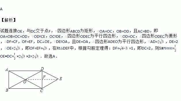 如图,矩形 ABCD 的对角线 AC 与 BD 相交于点 O,CE∥BD, DE∥AC , AD=2, DE=2,则四边形 OCED 的面积为( )