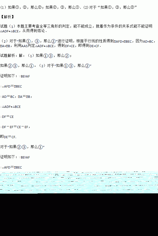 (10分)如图所示,△ADF和△BCE中,∠A=∠B,点D,E,F,C在同一条直线上,有如下三个关系式:①AD=BC;②DE=CF;③BE∥AF;