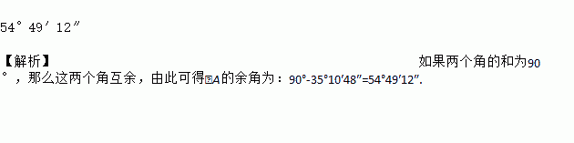54°49′12″ 【解析】如果两个角的和为90°,那么这两个角互余,由此可得∠A的余角为:90°-35°10′48″=54°49′12″.