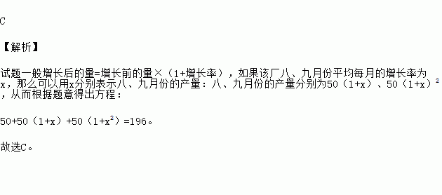 某机械厂七月份生产零件50万个,第三季度生产零件196万个.设该厂八、九月份平均每月的增长率为x,那么x满足的方程是