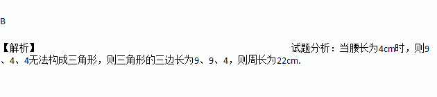 如果等腰三角形两边长是9cm和4cm,那么它的周长是( )。