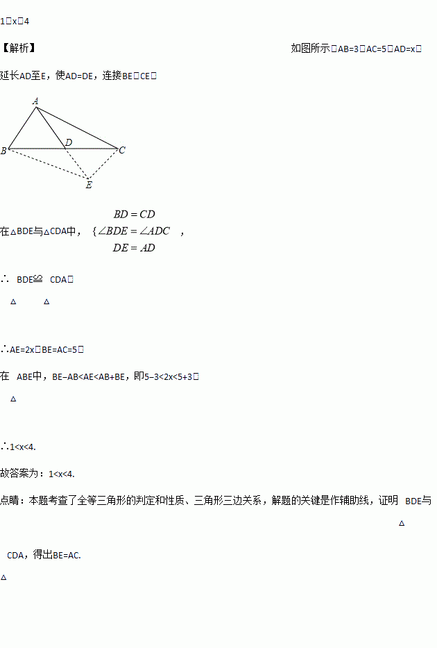 已知一个三角形的两边长分别为5和3,则第三边上的中线x的取值范围是________。