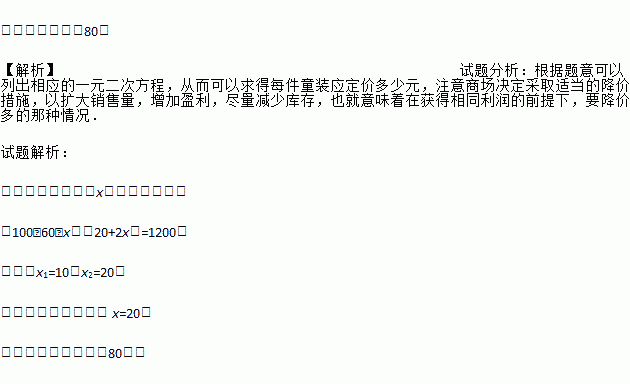 银隆百货大楼服装柜在销售中发现:“COCOTREE”牌童装每件成本60元,现以每件100元销售,平均每天可售出20件.为了迎接“五•一”劳动节,商场决定采取适当的降价措施,以扩大销售量,增加盈利,尽量尽快减少库存.经市场调查发现:如果每件童装降价1元,那么平均每天就可多销售2件.要想平均每天销售这种童装盈利1200元,请你帮商场算一算,每件童装应定价多少元?