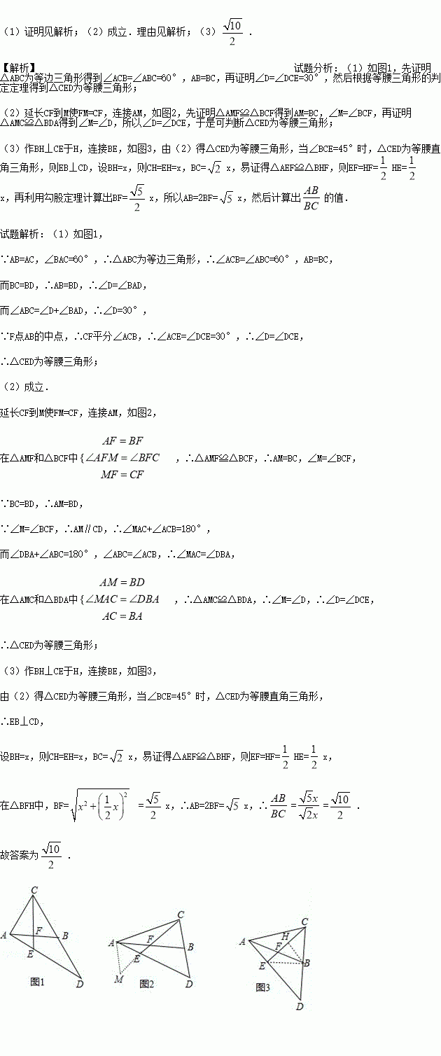 (1)如图1,若∠BAC=60°,求证:△CED为等腰三角形