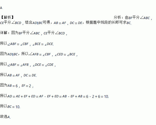 如图,在平行四边形ABCD中,BF平分∠ABC,交AD于点F,CE平分∠BCD,交AD于点E,AB=6,EF=2,则BC长为( )