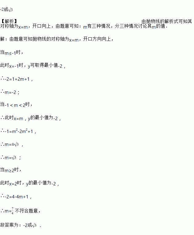 已知二次函数 y=x²﹣2mx+1 (m 为常数),当自变量 x 的值满足﹣1≤x≤2 时,与其对应的 函数值 y 的最小值为-2,则 m 的值为_____.