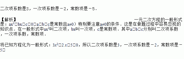 写出方程3 x 2 =2 x+ 5的二次项系数、一次项系数及常数项.