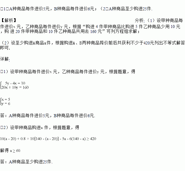 (2)若该商店购进甲、乙两种商品共 140 件,都标价 10 元出售,售出一部分降价促销, 以标价的八折售完所有剩余商品,以 10 元售出的商品件数比购进甲种商品件数少 20 件,该商店此次购进甲、乙两种商品降价前后共获利不少于 420 元,求至少购进甲种商品多少件?