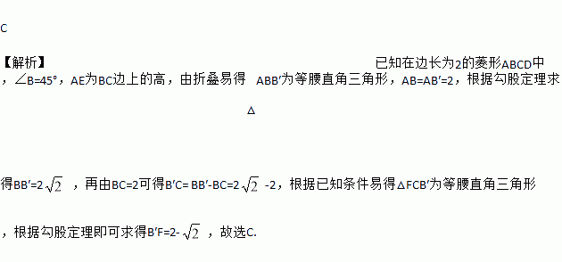 如图,在边长为2的菱形ABCD中,∠B=45°,AE为BC边上的高,将△ABE沿AE所在直线翻折得△AB′E,AB′与CD边交于点F,则B′F的长度为( )