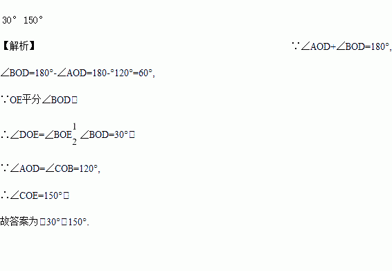 如图,直线AB、CD相交于点O,OE平分∠BOD,∠AOD=120°,则∠DOE=________,∠COE=_________.