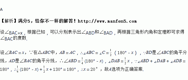 如图,△ABC中,AB=AC,∠BAC、∠ABC的角平分线相交于点D.若∠ADB=130°,则∠BAC等于( )