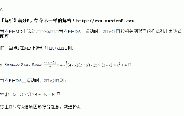 如图,正方形ABCD的边长为4,点M是CD的中点,动点E从点B出发,沿BC运动,到点C时停止运动,速度为每秒1个长度单位;动点F从点M出发,沿M→D→A远动,速度也为每秒1个长度单位:动点G从点D出发,沿DA运动,速度为每秒2个长度单位,到点A后沿AD返回,返回时速度为每秒1个长度单位,三个点的运动同时开始,同时结束.设点E的运动时间为x,△EFG的面积为y,下列能表示y与x的函数关系的图象是( )