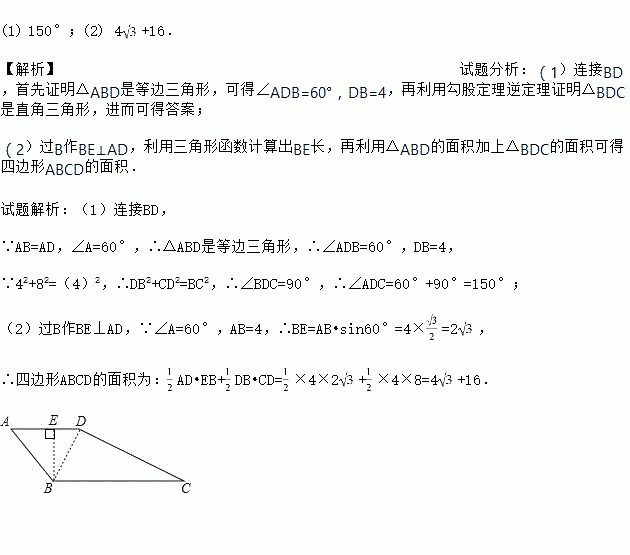 如图,在四边形ABCD中,AB=AD=4,∠A=60°,BC=4,CD=8.
