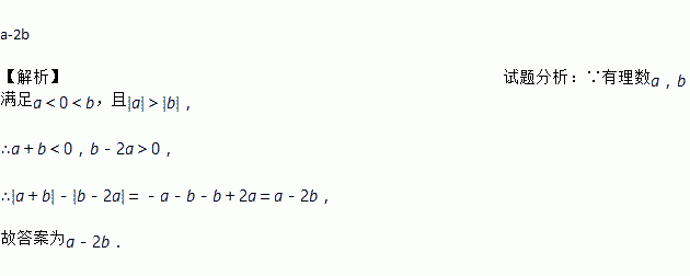 a-2b 【解析】试题分析:∵有理数a,b满足a<0<b,且|a|>|b|, ∴a+b<0,b-2a>0, ∴|a+b|-|b-2a|=-a-b-b+2a=a-2b, 故答案为a-2b.