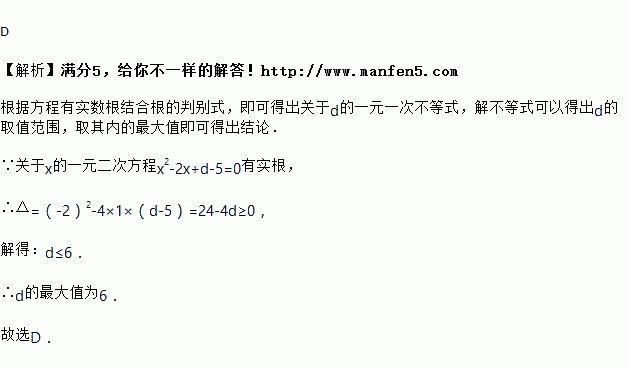 关于x的一元二次方程x2﹣2x+d﹣5=0有实根,则d的最大值为( )