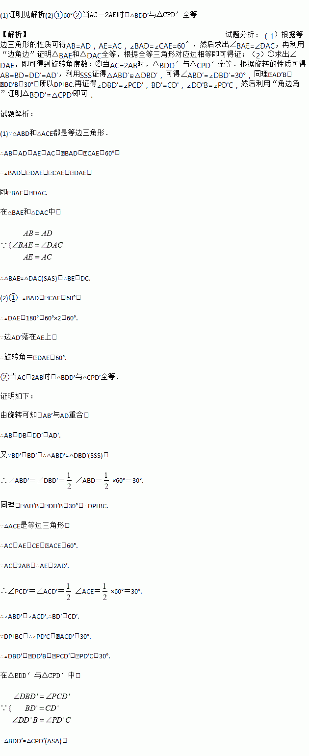 ②在①的条件下,延长DD′交CE于点P,连结BD′,CD′.当线段AB,AC满足什么数量关系时,△BDD′与△CPD′全等?并给予证明.