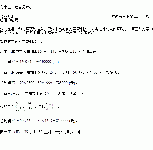 当地一家蔬菜公司收获这种蔬菜140吨,该公司加工厂的生产能力是:如果对蔬菜进行粗加工,每天可加工16吨;如果进行精加工,每天可加工6吨,但两种加工方式不能同时进行,受季节等条件限制,公司必须在15天内将这批蔬菜全部销售或加工完毕,为此公司制订了三种方案:
