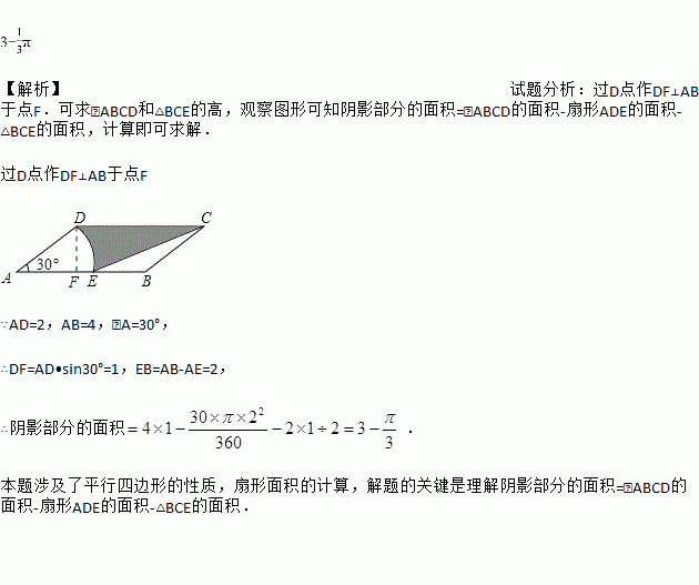 如图,在平行四边形ABCD中,AD=2,AB=4,∠A=30°,以点A为圆心,AD的长为半径画弧交AB于点E,连接CE,则阴影部分的面积是______(结果保留π).