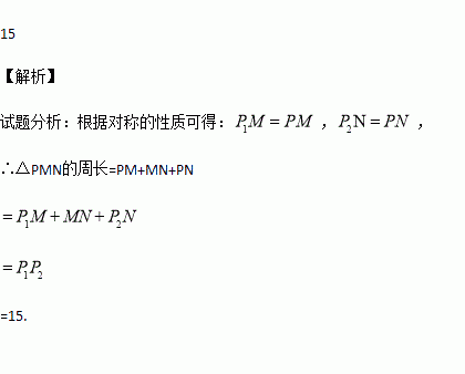 如图:点P为∠AOB内一点,分别作出P点关于OA、OB的对称点P1,P2,连接P1P2交OA于N,交OB于M,P1P2=15,则△PMN的周长为 .
