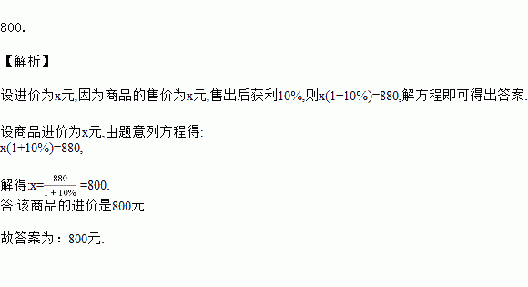 一件不打折的商品,售价为880元,能获利10%,则该商品的进价为 元.