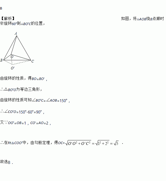 Èçͼ£¬OÊǵȱߡ÷ABCÄÚµÄÒ»µã£¬OB£½1£¬OA£½2£¬¡ÏAOB£½150¡ã£¬ÔòOCµÄ³¤Îª£¨ £©