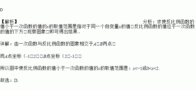 如图,一次函数与反比例函数的图象相交于A、B两点,则图中使反比例函数的值小于一次函数的值的x的取值范围是( )