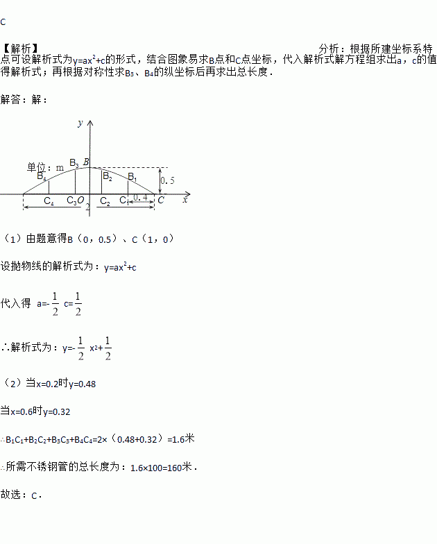 C 【解析】分析:根据所建坐标系特点可设解析式为y=ax2+c的形式,结合图象易求B点和C点坐标,代入解析式解方程组求出a,c的值得解析式;再根据对称性求B3、B4的纵坐标后再求出总长度. 解答:【解析】 (1)由题意得B(0,0.5)、C(1,0) 设抛物线的解析式为:y=ax2+c 代入得 a=-c= ∴解析式为:y=-x2+ (2)当x=0.2时y=...