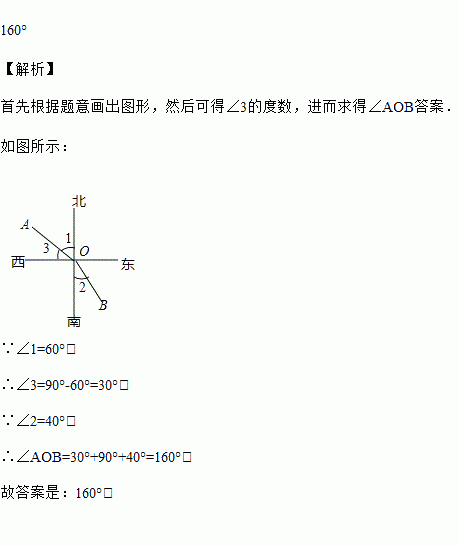 已知点A在O的北偏西60°方向,点B在点O的南偏东40°方向,则∠AOB的度数为_____
