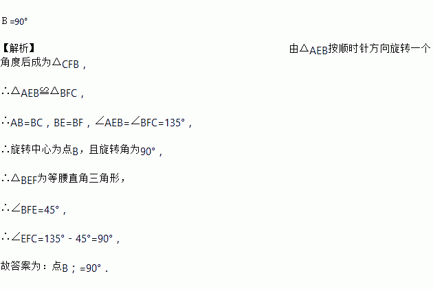 如图,E为正方形ABCD内一点,∠AEB=135°,△AEB按顺时针方向旋转角度后成为△CFB,图中_____是旋转中心,∠EFC_____.