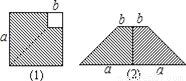 查看答案在边长为a的正方形中挖去一个边长为b的小正方形(a>b),再沿虚线剪开,如图(1),然后拼成一个梯形,如图(2),根据这两个图形的面积关系,表明下列式子成立的是( )