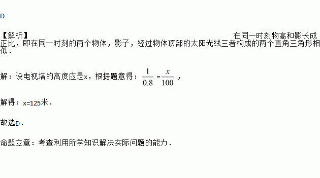 1米长的标杆直立在水平的地面上,它在阳光下的影长为0.8米;在同一时刻,若某电视塔的影长为100米,则此电视塔的高度应是( )