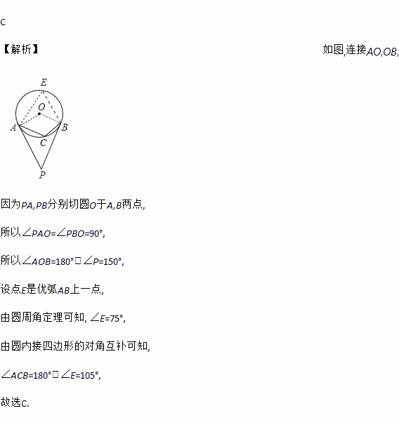 C 【解析】如图,连接AO,OB, 因为PA,PB分别切圆O于A,B两点, 所以∠PAO=∠PBO=90°, 所以∠AOB=180°-∠P=150°, 设点E是优弧AB上一点, 由圆周角定理可知, ∠E=75°, 由圆内接四边形的对角互补可知, ∠ACB=180°-∠E=105°, 故选C.
