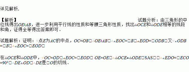 如图,在RtΔABC中,∠C=90º,以BC为直径作⊙O交AB于点D,取AC的中点E,边结DE,OE、OD,求证:DE是⊙O的切线。
