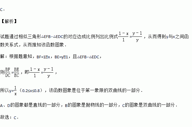 如图,边长为1的正方形ABCD中,点E在CB延长线上,连接ED交AB于点F,AF=x(0.2≤x≤0.8),EC=y.则在下面函数图象中,大致能反映y与x之间函数关系的是( )